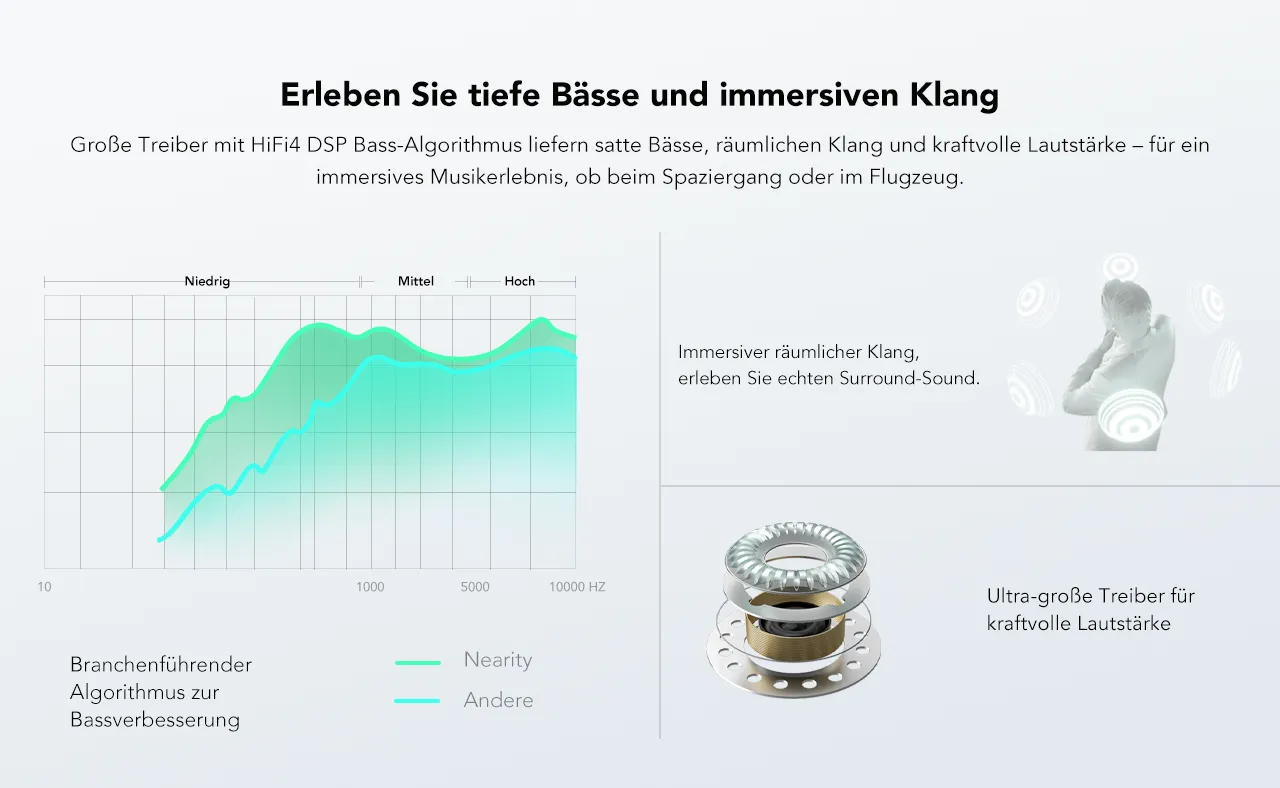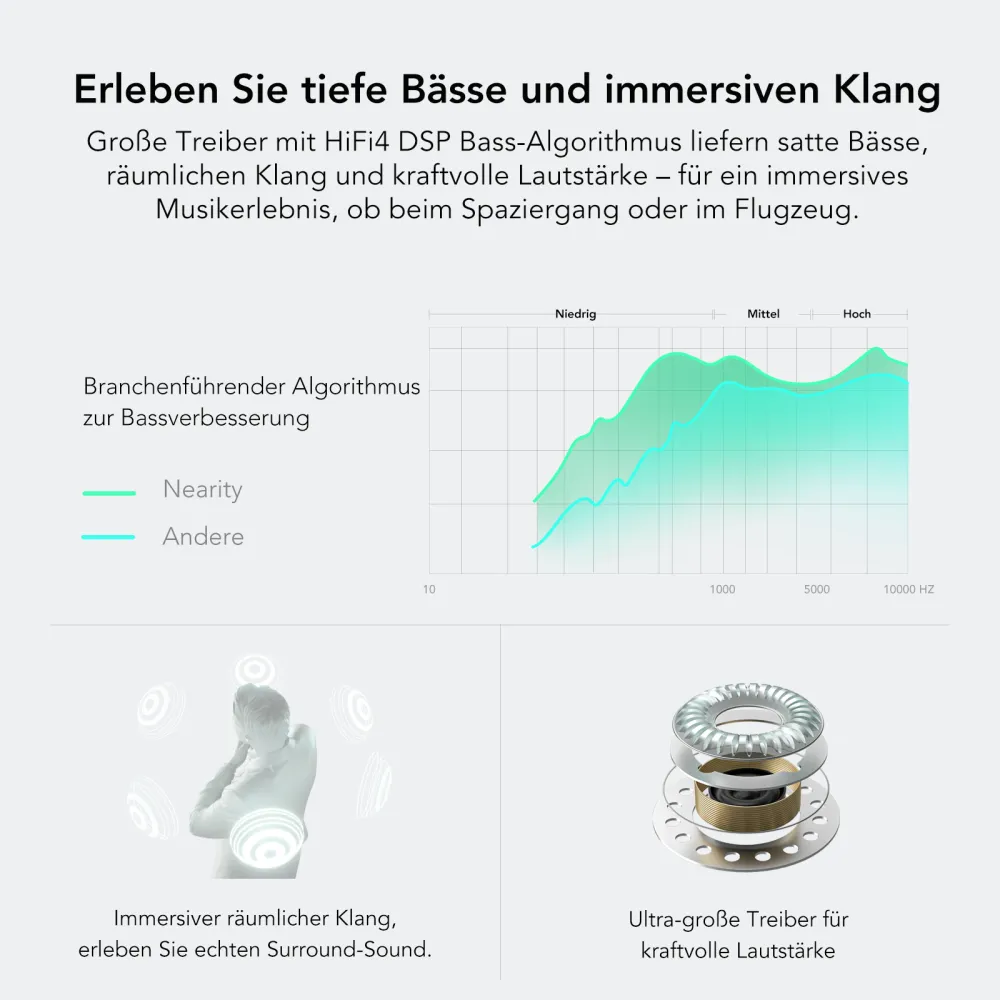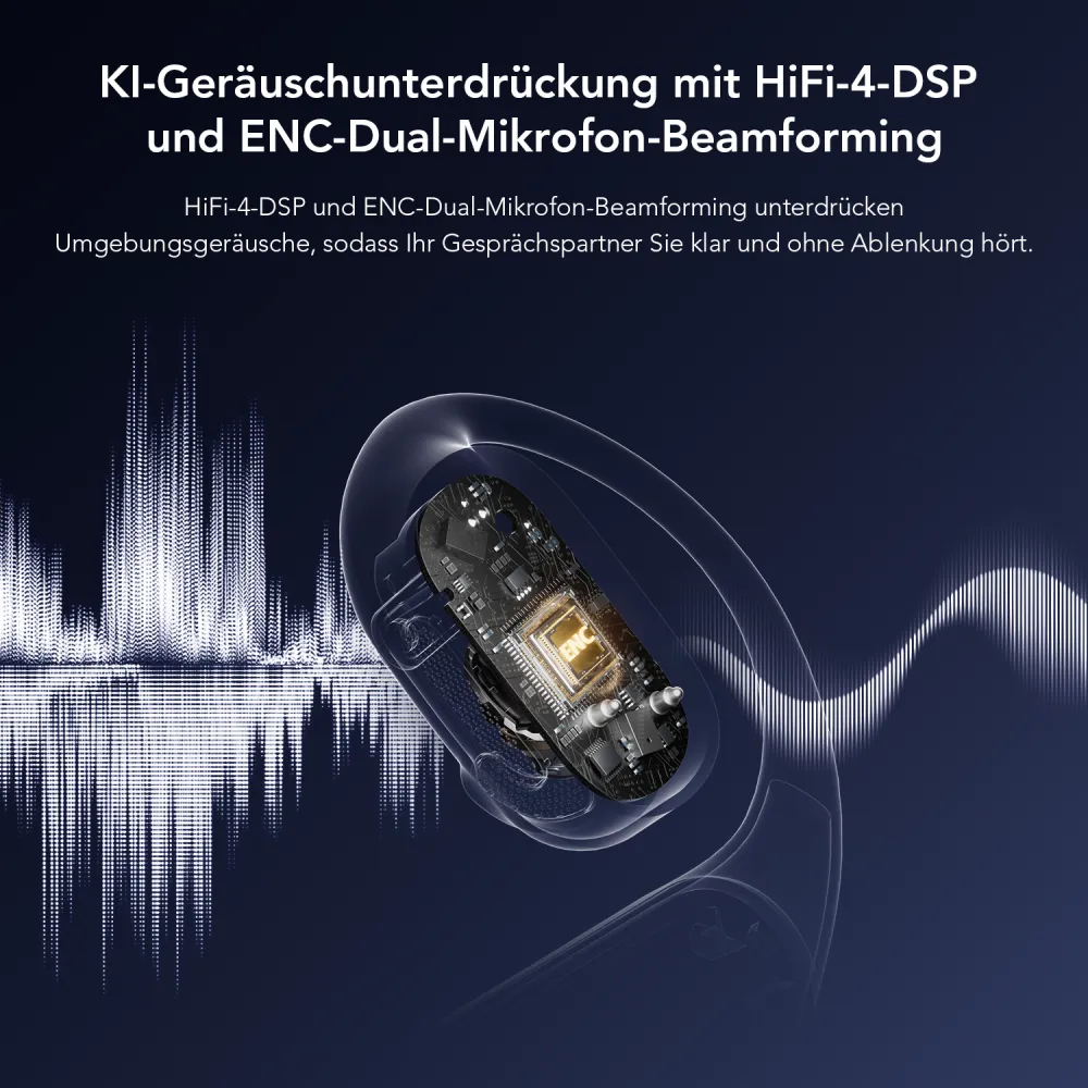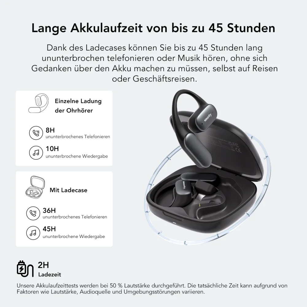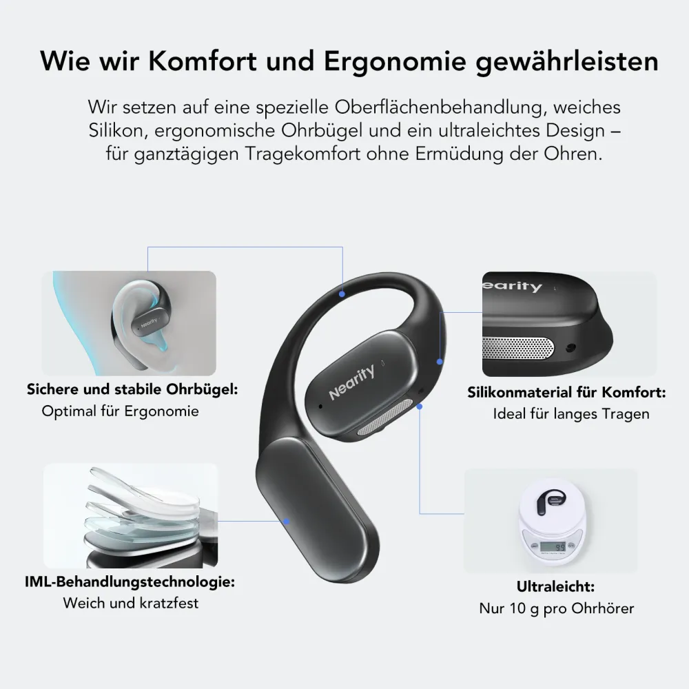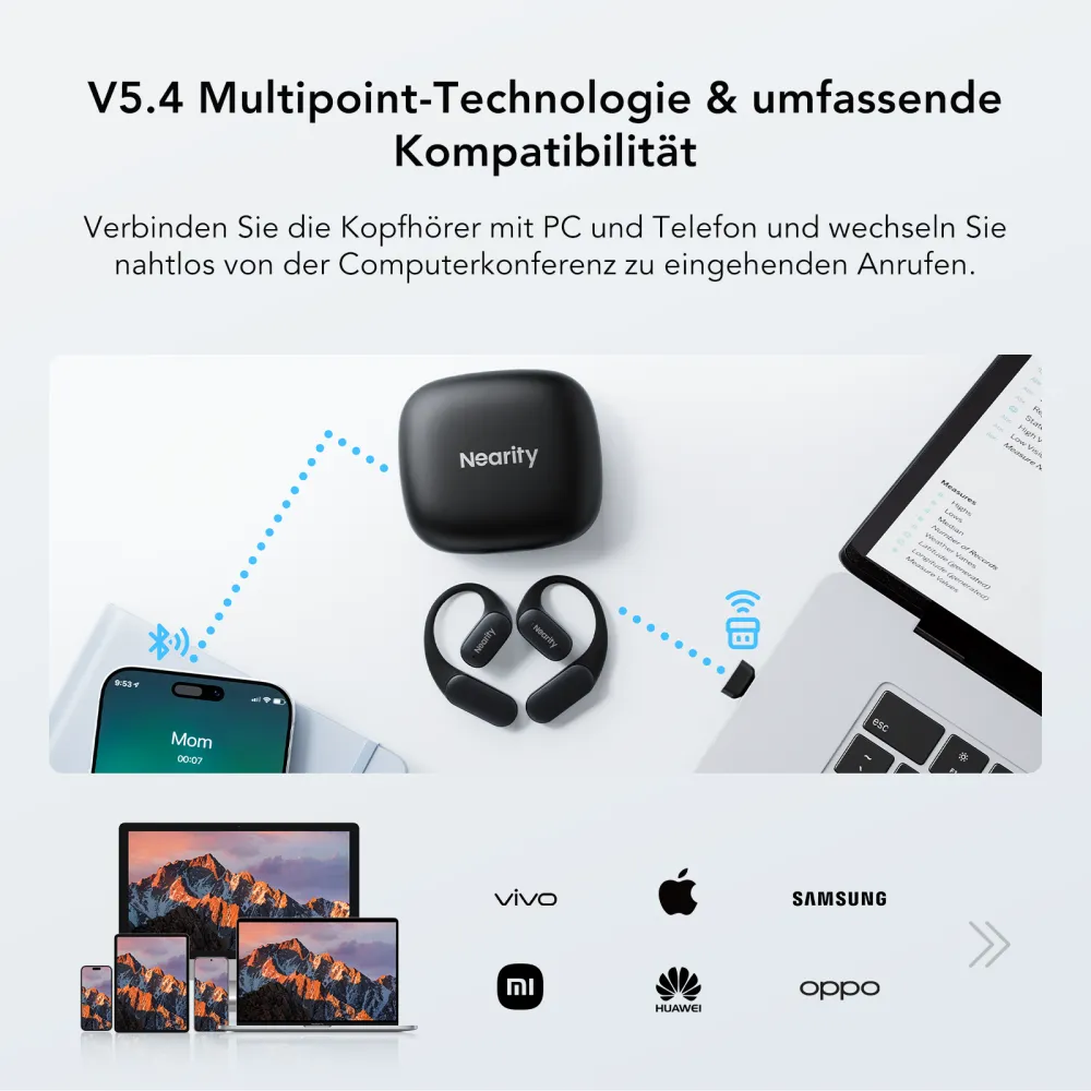 Open Ear Kopfhörer sind ultraleicht, bequem für den ganzen Tag, liefern satten Bass, klaren Klang, HiFi-4-DSP, ENC-Geräuschunterdrückung und kommen mit USB-Dongle