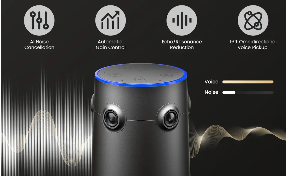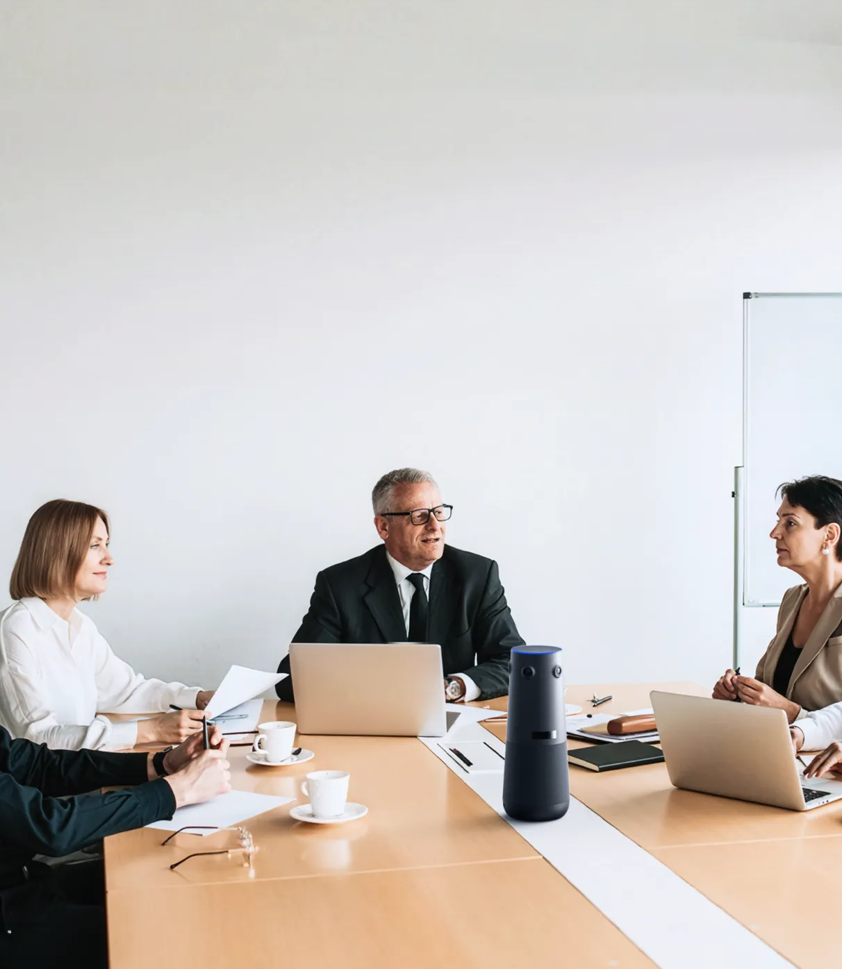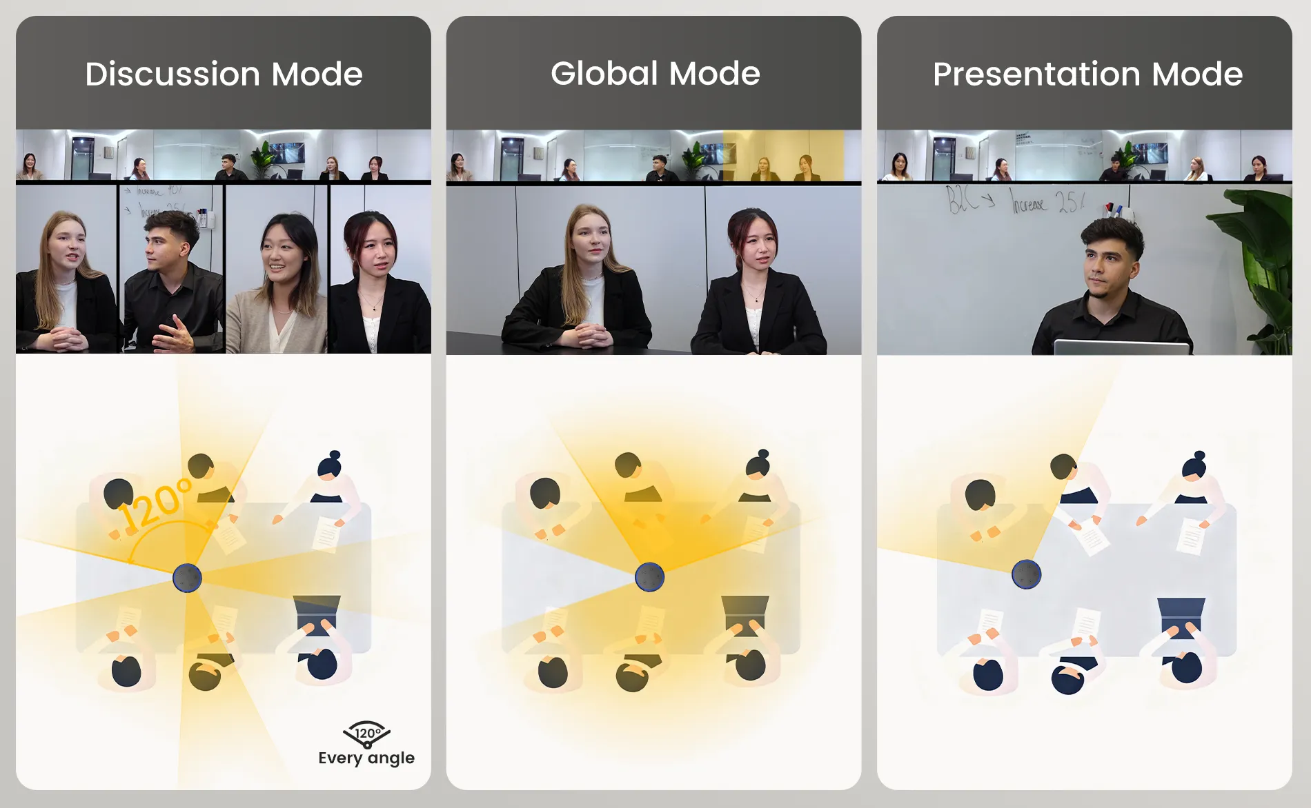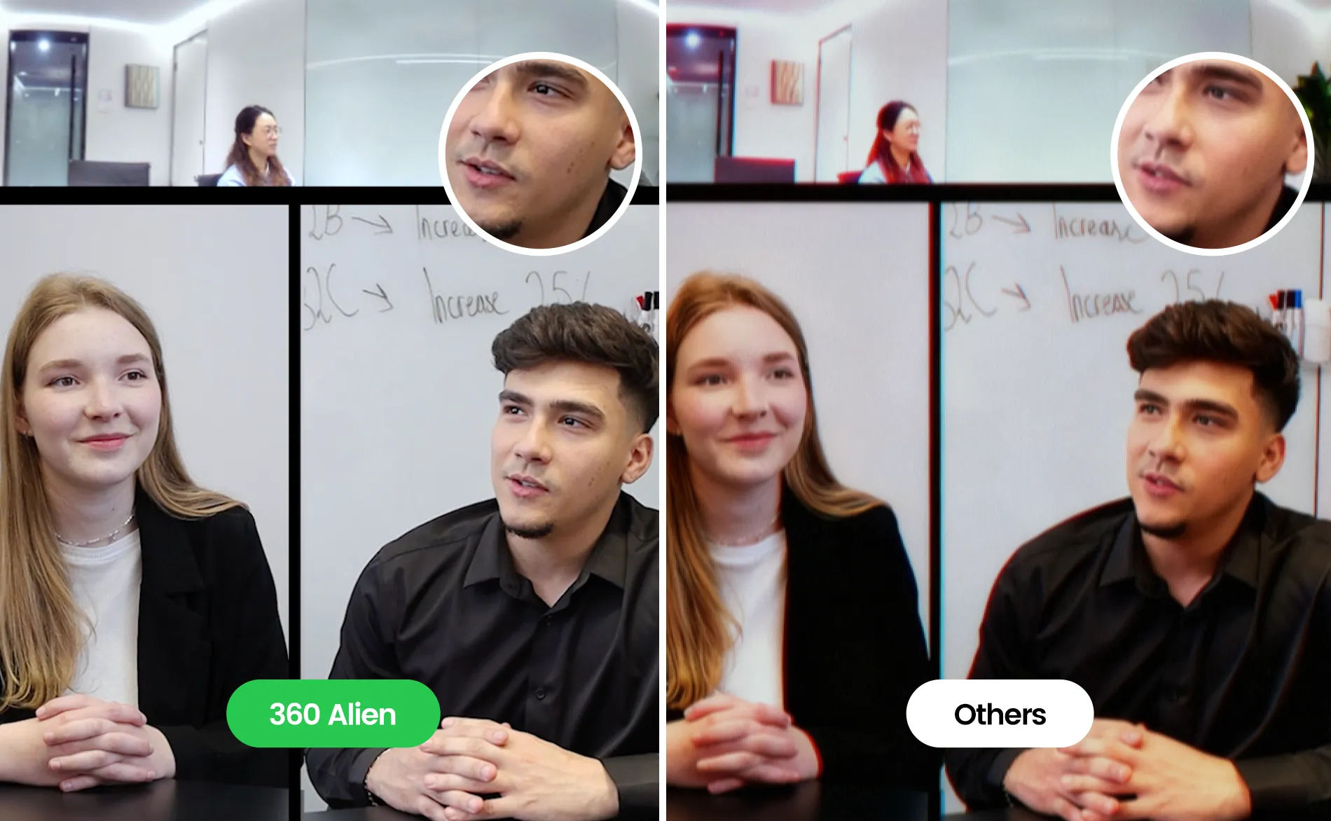 Instead of relying on a single fisheye lens, 360 Alien uses four true 4K UHD cameras working together to capture every angle with consistent sharpness. This multi-camera design avoids distortion and edge blur, delivering clearer faces, smoother speaker transitions, and a more accurate visual experience—especially in hybrid meetings.