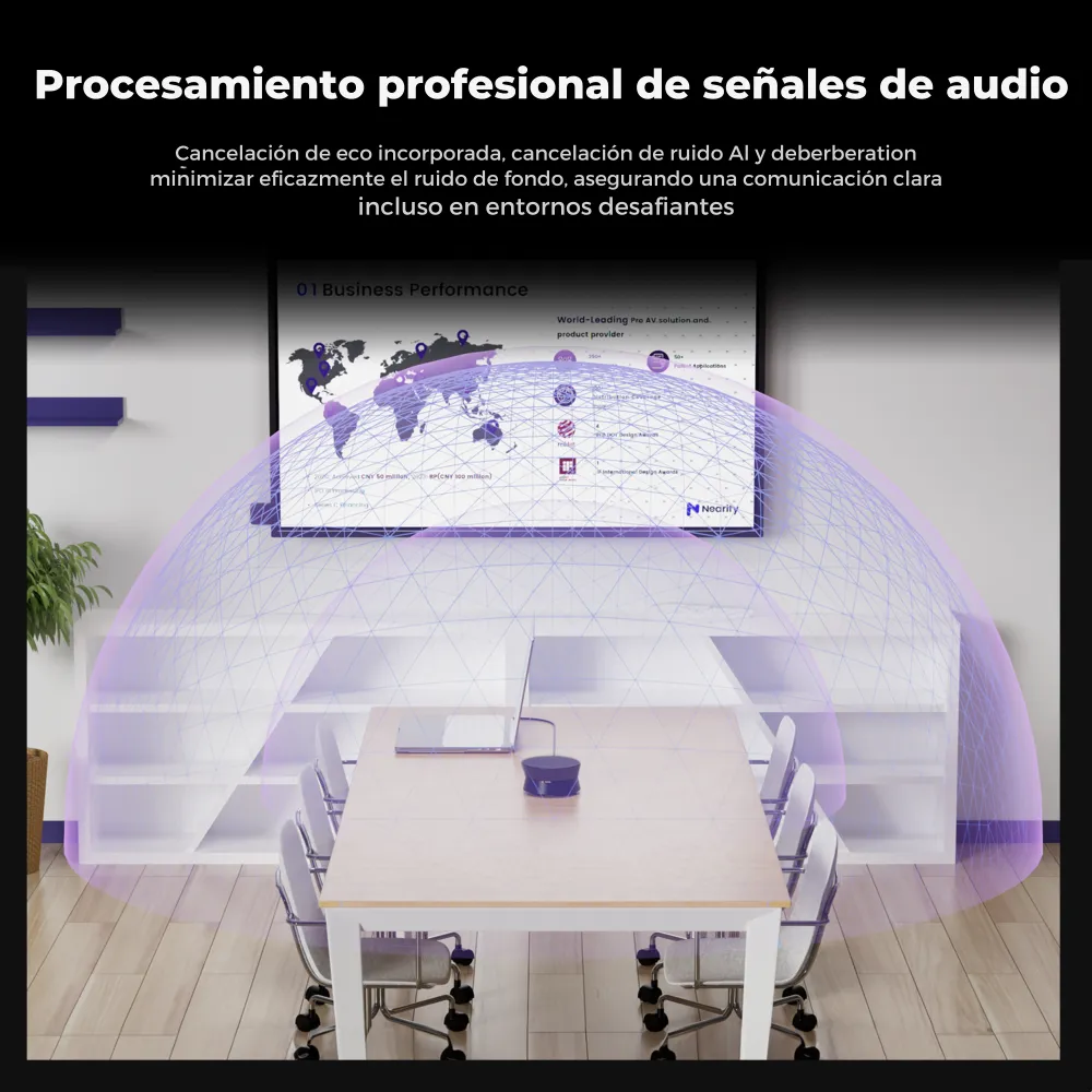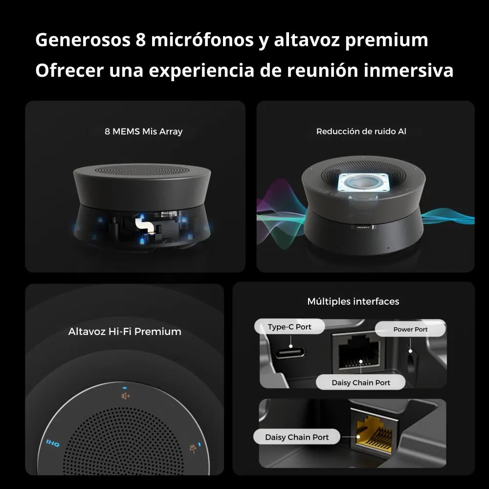 En espacios medianos, hasta cuatro micrófonos interconectados ofrecen una captación de sonido inmersiva con ocho micrófonos omnidireccionales por unidad. La cancelación de eco y reverberaciones IA 2.0 asegura discusiones fluidas, incluso con más participantes.