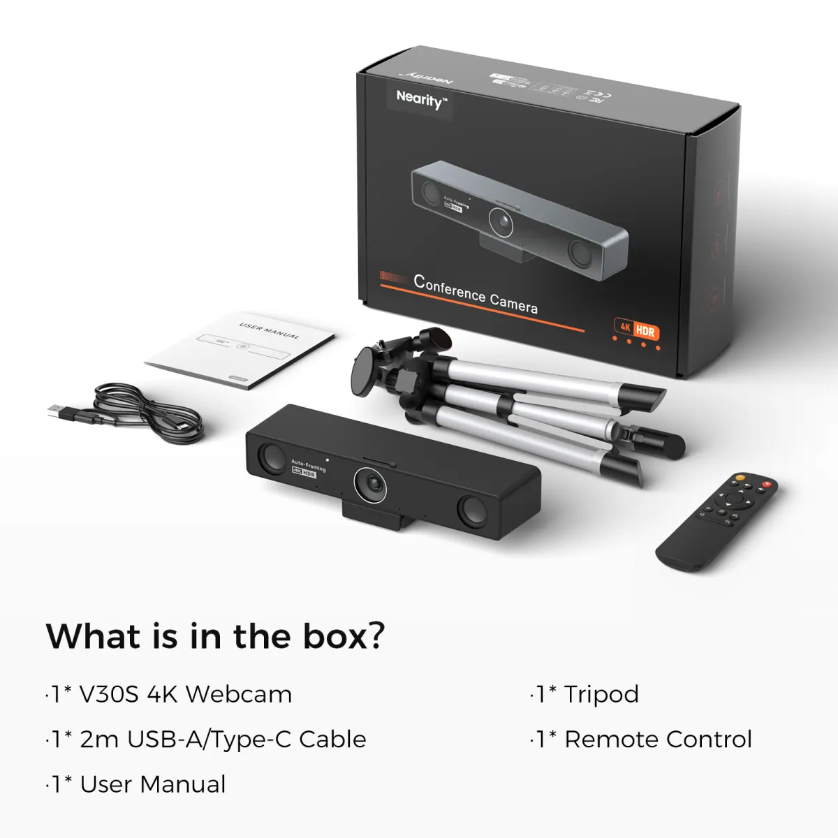 Flexibly configure the V30S to match your meeting environment. Place it on top of a display, mount it on the included tabletop tripod, or attach it to a floor stand using the standard 1/4' screw thread. Easily adjust angles and height to achieve the perfect perspective for every meeting room.