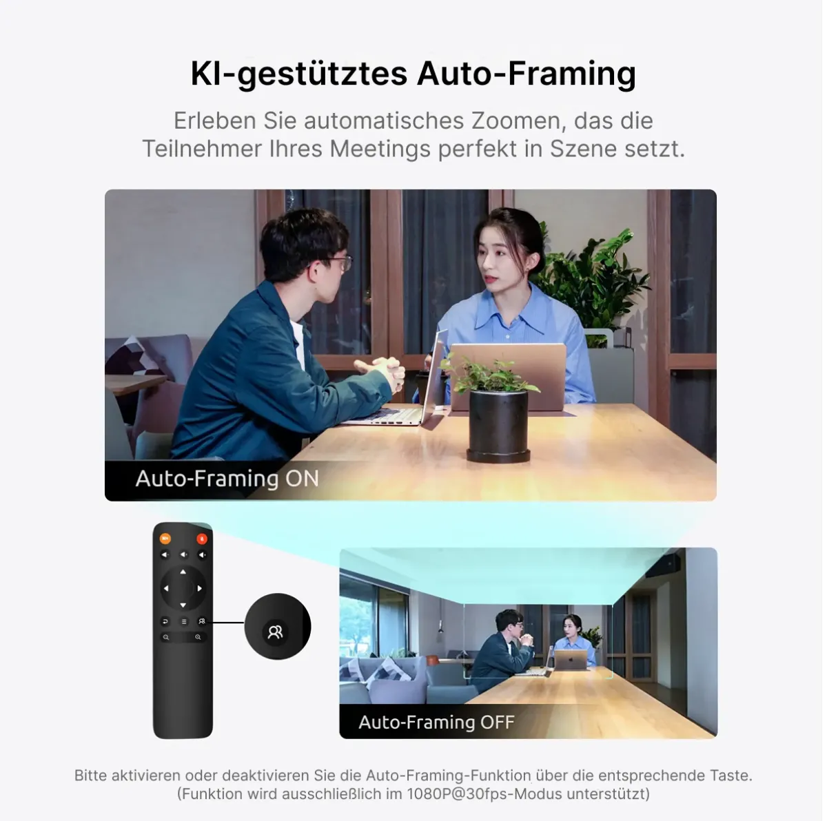 Die Kamera erkennt automatisch alle Teilnehmer und richtet das Bild entsprechend aus, ganz ohne manuelle Anpassung. Egal, ob in Bewegung oder beim Präsentieren, alle bleiben perfekt zentriert und professionell im Bild..