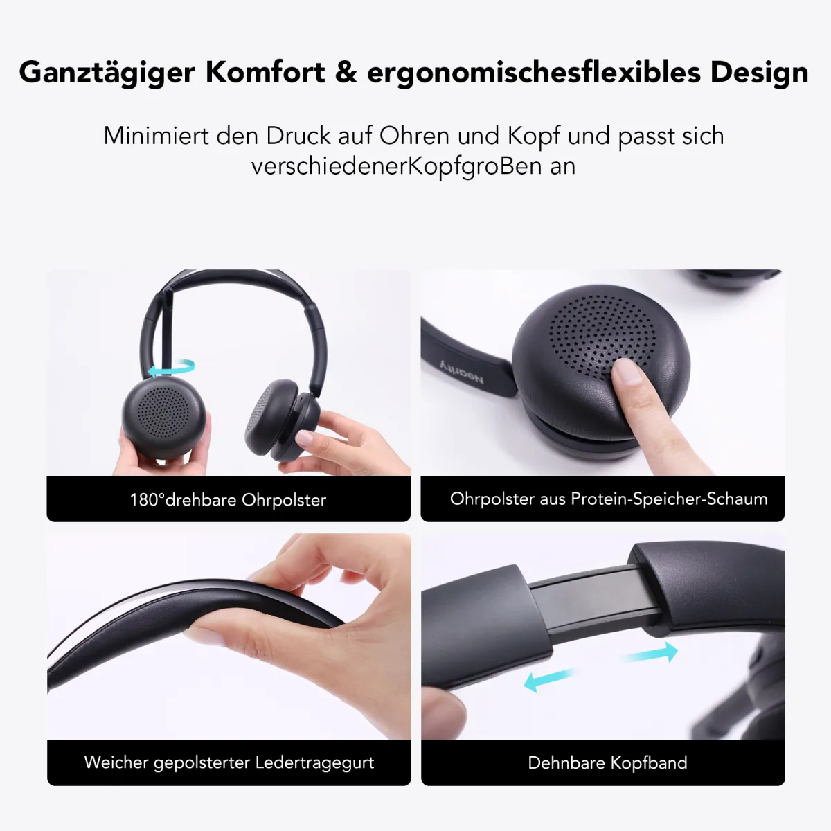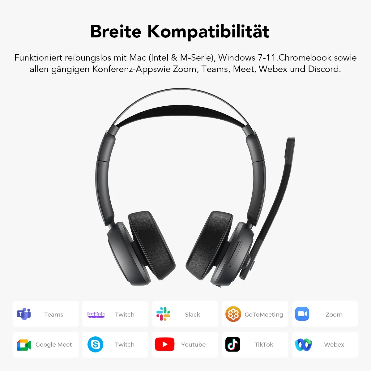 mit 4 Mikrofon-AI-Algorithmus, der auf HiFi4 DSP läuft, Dongle für einfache PC-Verbindung, 45 Stunden Akkulaufzeit und Ladestation.