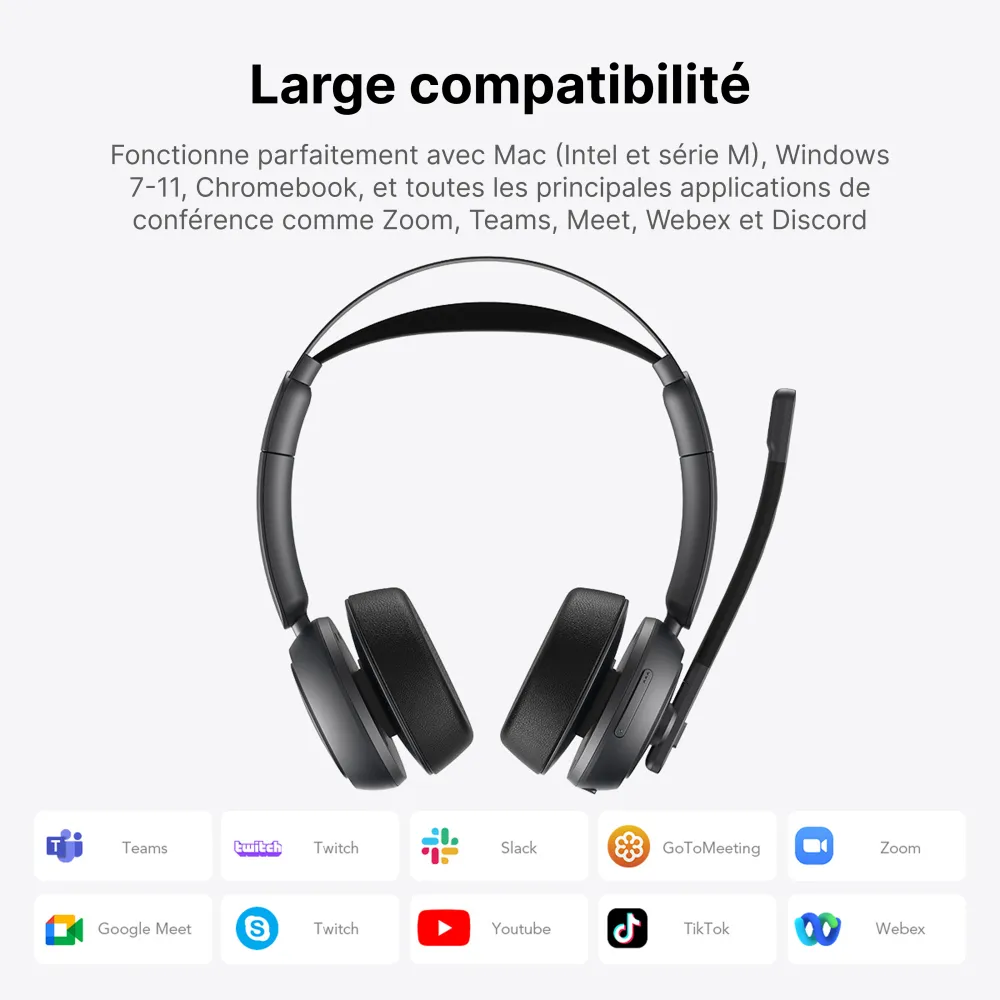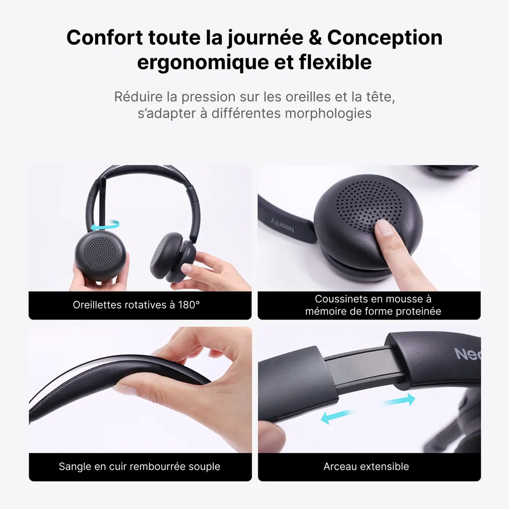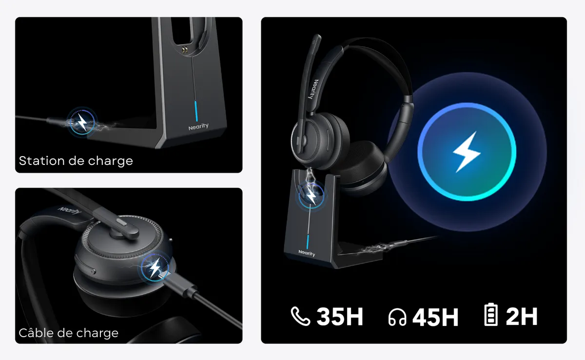 Avec algorithme IA 4 micros fonctionnant sur HiFi5 DSP, clé USB pour connexion PC facile, 45 heures d'autonomie et support de charge inclus.