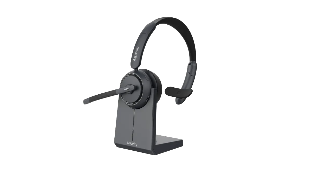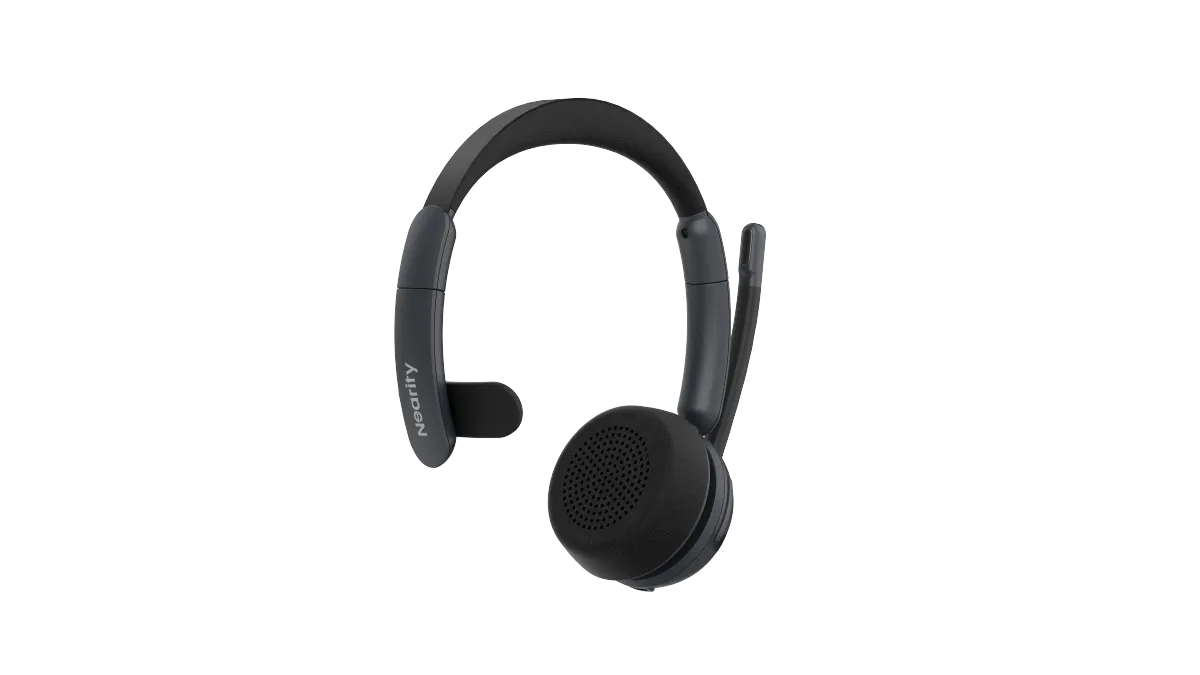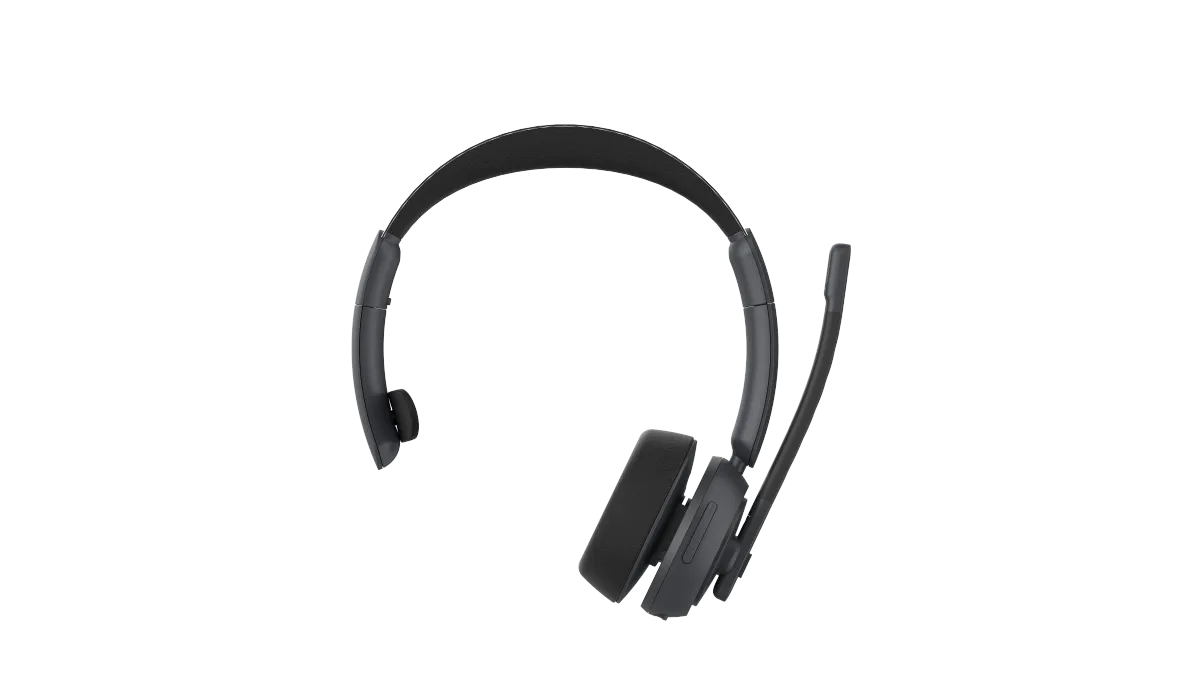 ノイズキャンセリングマイク搭載Bluetoothヘッドセット(片耳用)、充電スタンド付属、マルチポイント接続・ミュート機能対応、最大45時間再生可能。PC、トラック運転手、オフィス、コールセンター向け。