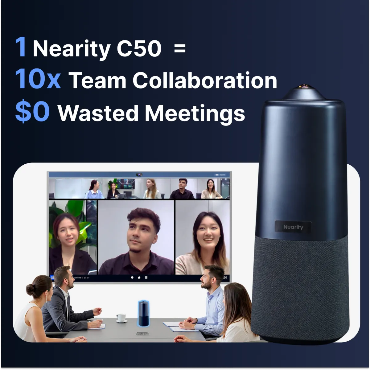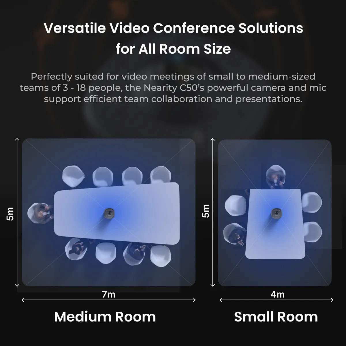 Perfectly suited for formal meetings of small teams of 6-8 people, the Nearity C50 Pro's powerful audio and video features support efficient team communication and presentation, making it the ideal conference camera for 360 video in smaller space.