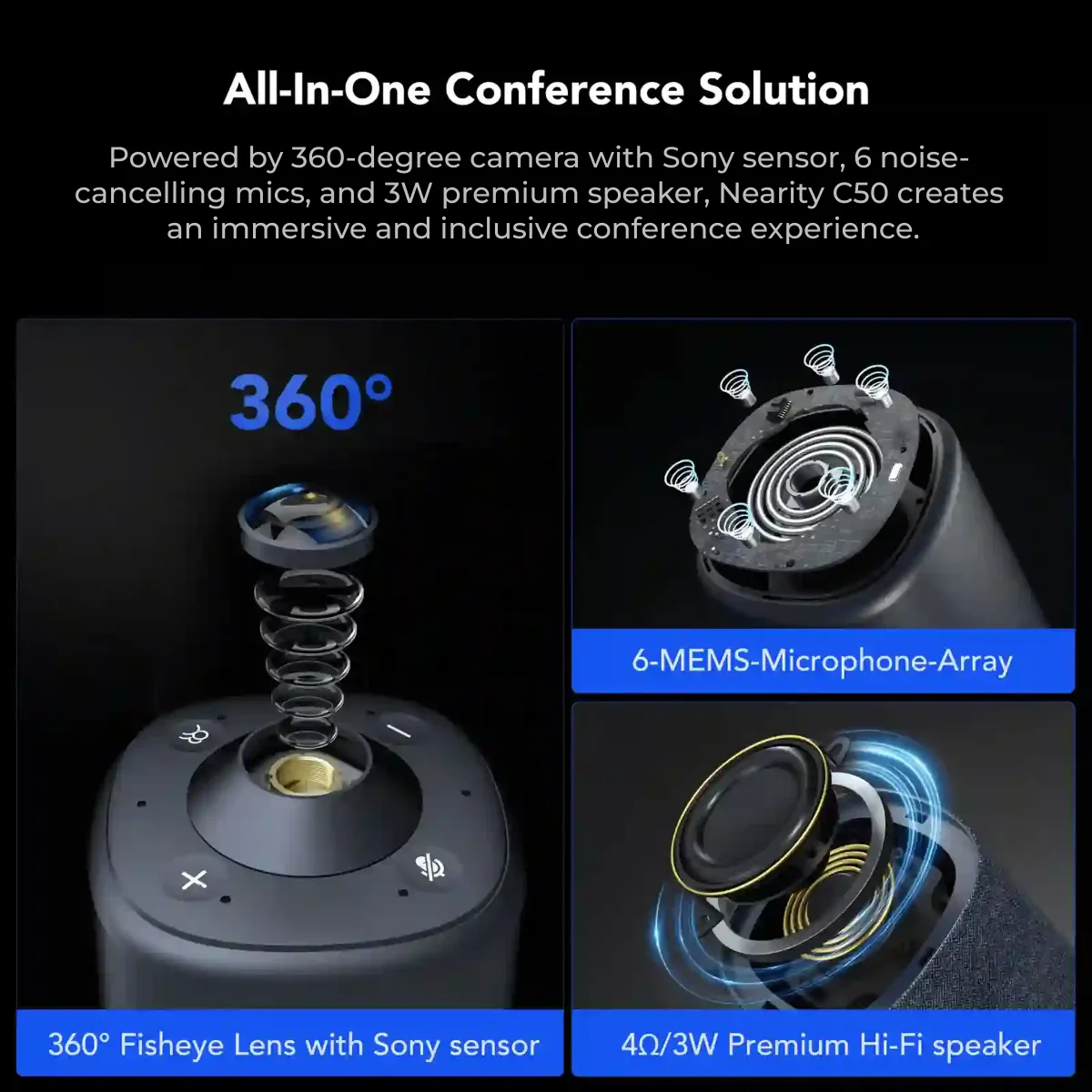 with 360-degree 1080P lens, 6 noise-cancelling mic, premium speaker and usb plug-n-play.